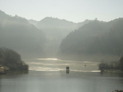ダム湖では釣り人がボートを出している。朝の湖が靄に沈む。