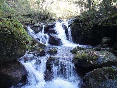 上流へ向かって歩き始める。水量が多い。川の石は大きく、岩と呼んだほうが良い。それらは緑に苔むしており、その様子は奥多摩の沢に似ているが、岩が大きい。