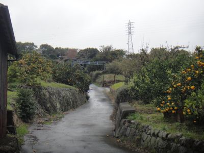 対岸に渡ったら、ブロック護岸の脇の土斜面のヤブを登り、舗装道路に出る。