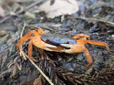山を歩いていると、透き通ったオレンジと黒の沢ガニがいた