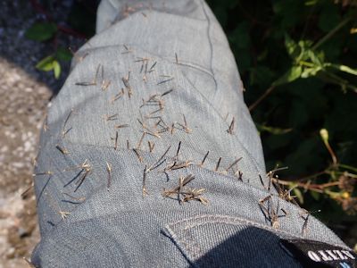 コセンダングサの針状の種子がどんどん服に突き刺さってくる