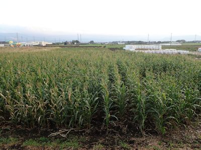 辺りを見回すと、自転車に乗った学生服のかかし、ベンチに座ったかかし、乳母車を押すかかしなど、たくさんのかかしがまったくのどかな田園に、異様な光景を産みだしている。後ろは花畑なので、その異様さが際立つ。