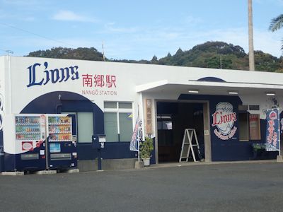 日南線の南郷駅へ。駅の建物にでかでかと「Lions」の文字とロゴが書かれている。