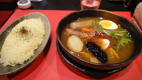 遅い昼飯は、札幌名物、スープカレー。「札幌スープカレー横丁」内にある、「ラサタ」という店でスープカレーをいただく。赤と黒に統一された店内は、キャバクラのような雰囲気でなかなか異様であるが、ライトが若干暗めなので、さしたる違和感はない。