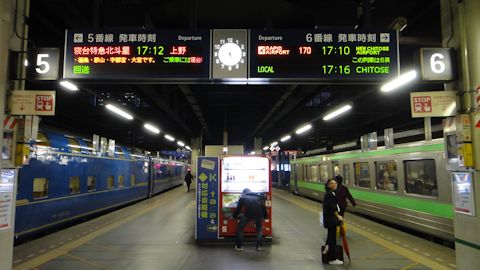 17時まで歩き回り、17:10札幌駅発エアポート快速で新千歳空港へ。所要36分、運賃1040円とバカ高。エアポート快速は、山手線みたいな、銀色に薄緑のストライプの車両。札幌駅向かいのホームには、17:12発上野行きのブルートレイン、北斗星がこれまた出発を待ち構えていた。津軽海峡冬景色かぁ。北斗星、乗ってみたい。札幌−上野間を結ぶ寝台特急である。北斗星の停車駅を見ると、郡山も停まる。なんだ、札幌から電車一本で郡山に帰れるんじゃないか。いいなぁ。