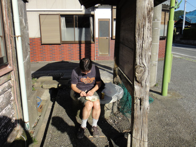 この近くで昼飯を買わねばならない。ここから先,山の中に入っていくので店がない。今日は途中吉田屋がないので、コンビニで買おうと思っていたが、コンビニがない。小さな「○×商店」という地元商店をいくつか周り、おにぎり、カレーパン、肉まん、ロールケーキを買い込む。