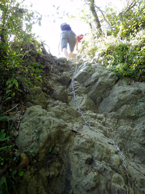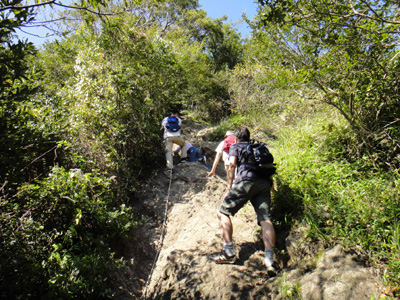 南、北、両方のピークを極め、僕らは山を降り始める。帰りもほなみちゃんの苦闘は続く。鎖場、ロープ場は彼女にとっては下るのも大変だ。コンスケが付きっ切りで声をかける。僕らも彼女を励まし、ようやく鎖場・ロープ場を突破。ここからは普通の下り道だ。