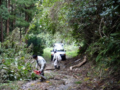 林道を塞いで倒れた木を除去するおじさん二人組
