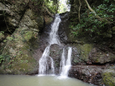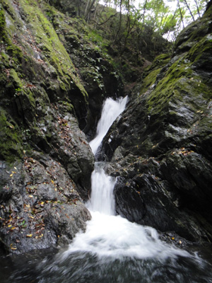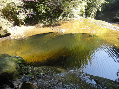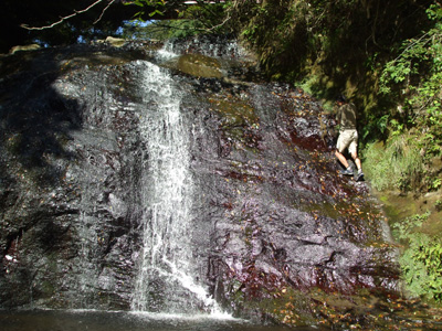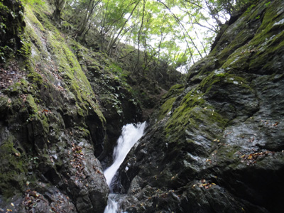 4段の本滝を登っていく。上の二段がそれぞれ3mくらいの滝となっている。2日前の台風のおかげで、水量は結構多いようだ。一番上の滝の下まで登って、足が止まる。えぐれた岩の上を幅広の水が落ちる。両側の岩を登ろうとするが、滑るし凹凸もない。さすがに今日は撥水シャツも着てないし、落水中をシャワークライムするのは気が引けた。結局登るのを断念。