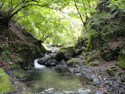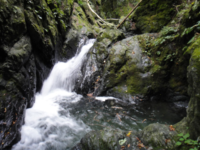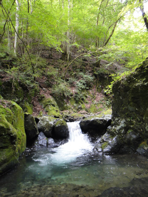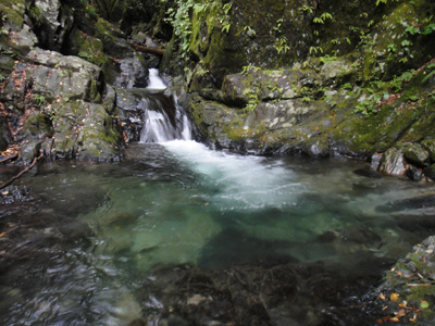 10m滝から上は、ゴルジュから解放され、谷は広々とし、穏やかな渓相となる。緑に苔むした岩々の間を透き通った水が流れ落ちる。