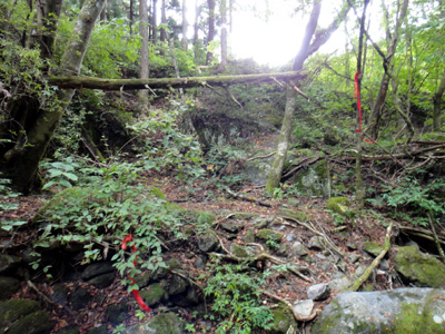 半円の滝の上流すぐにある赤テープ。ここから上がるも踏み後あやふや |