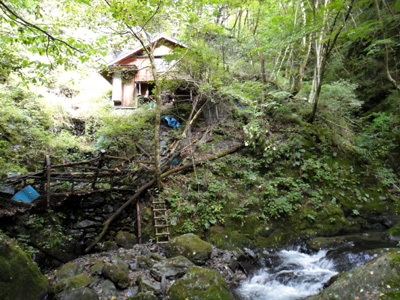 川の上の斜面に、かなり大きな家のような小屋が建っている。沢の中でこのようなまともな建物を見るのは珍しい。見かける人工物といえば、堰堤や護岸以外では、たいていが朽ちかけた小さな廃小屋で、昔は炭焼きとか伐採とか農作業とか何かの作業をしていたのだろうが、もう最近では川の中に入って作業をするようなこともなくなってきているのかもしれない。