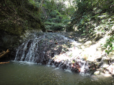 長沢にかかる沢山不動の滝群は、ジグザグに流れる渓流にいくつもの滝が連なり、木漏れ日が谷底に落ちてきて、絵になる風景だ。『ちば滝めぐり』によれば、長沢の6つの滝は、下流側から4つが各1m、その上に4段の本滝が高さ9.5m、さらに最上段に2.5mの上滝。合計6つの滝だ。
