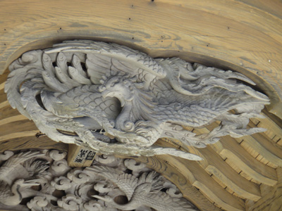 沢山不動尊本堂向拝にある龍の彫刻。江戸時代の彫刻家、後藤孝義の作。 |