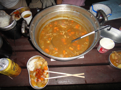 僕のもとてつもないボリュームだ。だが、昼飯は伊予が岳で魚肉ソーセージしか食っていない僕らは(注:石坂は焼肉野菜炒めを食べていた)、死ぬほど腹が減っていたので、各自ガツガツとすべてをやっつけた。ほなみちゃんのさば味噌煮定食も多かったが、父親のコンスケが手伝って完食。今日は誰も敗退せずに前回の超巨大アナゴ入り海鮮天丼の借りを返したわけである。