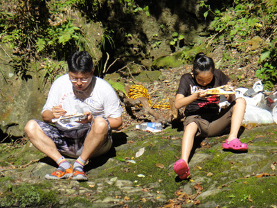 そして再びやって来ました、カエル滝。今日は巨大カエルの姿は見えない。この頃天気が怪しくなってくる。空は一面の白雲で覆われてしまった。日が陰ると途端に涼しい。もともと谷底には太陽が出ていても日が届かないことが多いのだが、曇ると風が一層冷たく感じられる。