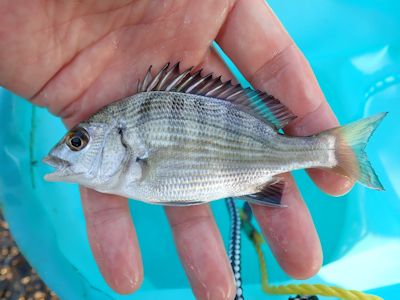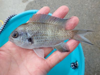 するとやっと小さな魚が1匹釣れた。クロダイである。だがこれまた極小(泣)。釣り始めてからもう2時間近く経っている。