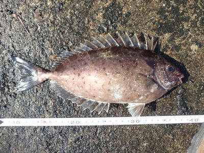 ウキ下5〜6mでウキが消し込み、小魚が釣れる。小マダイにウマヅラハギ。ウマヅラハギはヘチ際にいるのを何度か見ていたが、初めて釣れた。見た目はカワハギに似ている。おちょぼ口、頭の上の長い角にザラザラした体。だが、カワハギよりも体高がない。