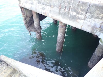 岸壁正面では釣れそうにないので、岸壁の北側を釣ることにする。岸壁の北側には海に埋没していく階段があり、ここから岸壁の北側ヘチをを釣ることにする。小魚がウジャウジャしている。ウマヅラハギ、フグ(確信なし)などがいる。