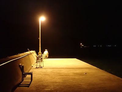 日が暮れる。イカ釣りのおじさんが一人やって来て、餌木を投げ始めた。堤防の先端には常夜灯があり、夜釣りに適している。