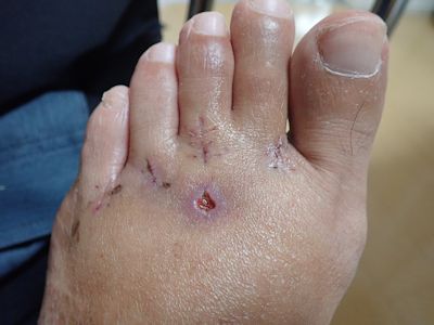 この日もベッドに寝て、左足は怖くて見れなかった。処置中、常にガーゼか何かで足を拭かれている感触があったので、相当出血していたに違いない。恐ろしい。