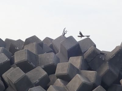 ベラをさらっていったトンビは、沖テトラの上に着地し、そこでおそらくベラを楽しんだはずなのだが、そこへサギ系の足の細い、首の長い白い鳥がやって来て、20mくらい離れたテトラの上に着地した。サギはじっとトンビを見ている。何が始まるのかと思ったら、サギがトンビの方に鋭く飛んで行って、トンビをそこから追い払ったのだ。えっ?