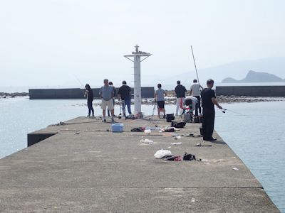 夏井港堤防先端にはたくさんの釣り人 |