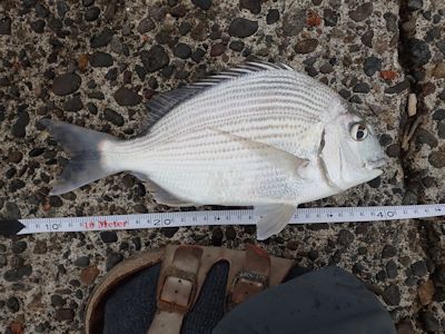 そしてヘダイ30cm。これは寄せるまではそんなに強くなく、何だろうと思ったが、堤防際でいきなり引き込んで暴れた。初めてタイらしいタイを釣った。