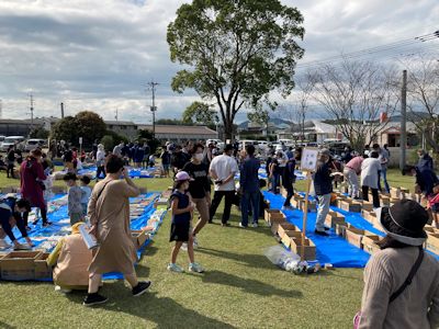 これは、串間市立図書館で除籍となった書物や、市民から不要となった書物を集め、それらを屋外のブルーシート上に並べ、誰でも好きな本を持ち帰ることができるというイベントである。
