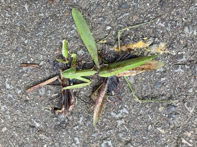 彼らは鮮やかな緑色をしているので、よく道路に映える。毎日のように、道路に出ているカマキリを目撃する。