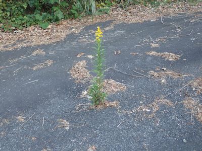 廃棄上へ続くアスファルトにの切れ目から、1本のセイタカアワダチソウがスクっと生えている。