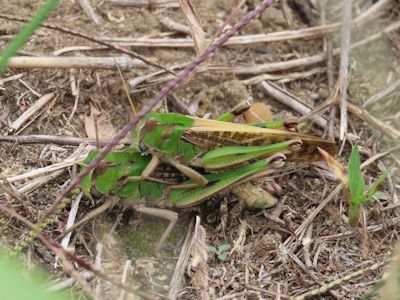 交尾するトノサマバッタ。上がオス、下がメス。トノサマバッタは