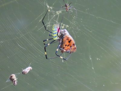 池に張り出した枝に巣を張ったジョロウグモが、網にかかったタテハチョウを捕食するところに出くわした。