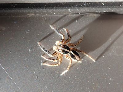 チャスジハエトリ。家でおなじみの小型のクモ。網は張らずに、