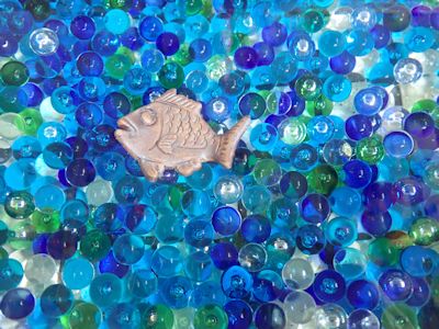 手水舎のシンクには、青いビー玉が敷き詰められている。ビー玉の上に、魚のおもちゃが置かれている。なかなかさわやかな演出じゃないか。
