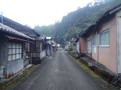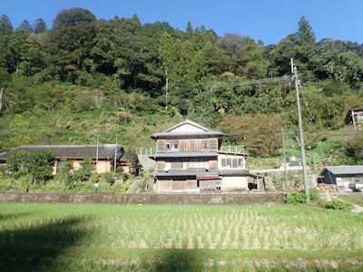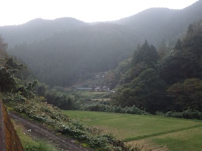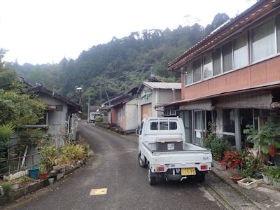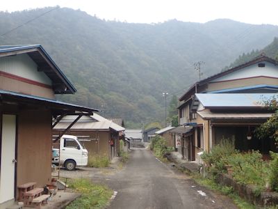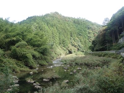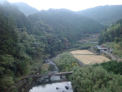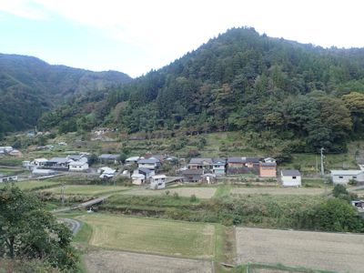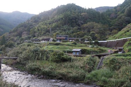 梼原町田野々地区。田野々川、民集落、そして山。これまた