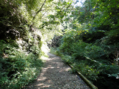 四角くて細長い、3mくらいの淵が現れる。両側の岩壁に挟まれて、狭いプールのようである。暑ければ泳ぐのに最高の場所だが、とても泳ぐ気になれない。軟弱に淵の上の右岸を歩く。