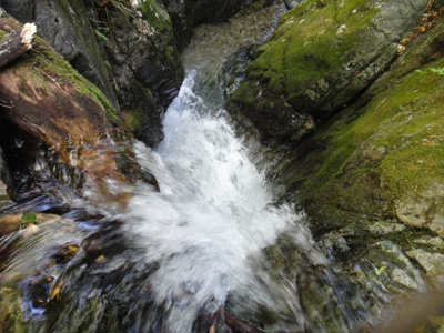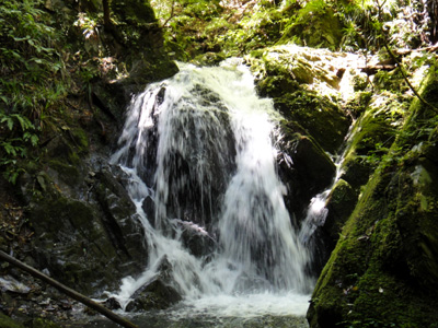 源頭が近づくにつれさらに水が少なくなり、ついには伏流になる。石がゴロゴロしたV地の涸れ沢をしばらく行くと、突然岩と水が現れ、10m以上の細い滝がルンゼ状の岩を滴り落ちている。登っていく。