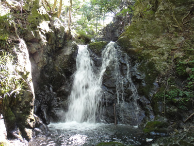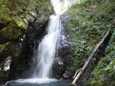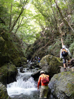 途中からはコンスケ、石坂、ベボの3人は崩れかけた登山道に上がり、それを戻る。僕と裕助は沢沿いを歩く。滝はまだまだ現れる。