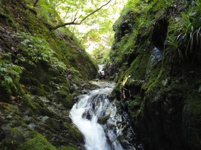 谷幅は狭いが水量は多い。石は緑に苔むしている。水に足を入れると、冷たい。うーん、これは泳ぐのは微妙だな、と渋くなる。