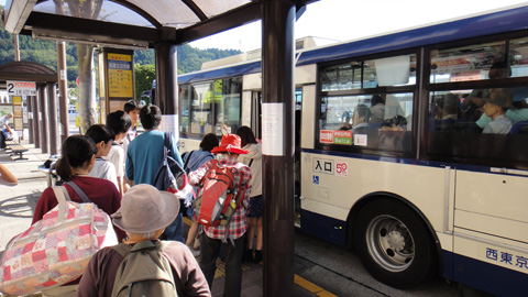今日もバスは増便が出ている。僕らが乗る9:30発丹波行きも通常便にさらに2台の増便が並んでいる。