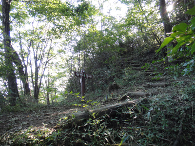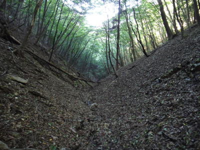 途中支涸れ沢が出合ってくるが、本流と思われるほうを進む。斜面の上に見える尾根まであと100mくらいとなり、涸れ沢は左右に二俣となる。川床の低い方が本流なので、左に進む。最後は急坂となる。落ち葉が敷き詰められている土の斜面を登る。