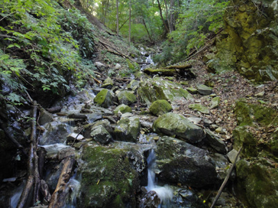そうやって下り続けると、下のほうから聞きなれた音が上がってくる。そう、水の音である。沢があるらしい。程なく沢が現れ、登山道は沢を交差して付けられている。