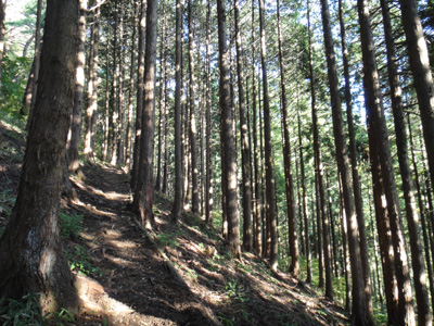 しばらく歩くと鎌沢方面と分かれて軍刀利神社方面の分岐が現れる。少し迷って軍刀利神社方面へ降りる。登山道は、植林帯の中を延々とジグザグ道となっている。斜面を真っ直ぐ登る道が付けられていたら、登る場合にはかなりキツい急登だろう。ジグザグはよろしい。ずんずんと下がっていく。道は踏み固められて歩きやすい。