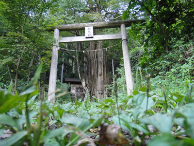 45分ほど降りると、軍刀利神社奥の院に到達。山の中にある神社。社殿の横に桂の巨木がある。とてつもなく太い。