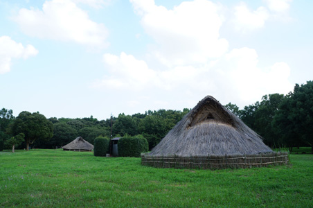 博物館の外に出る。貝塚跡は、広々としていて、緑に覆われている。ところどころに木々がある。野外での見所は、貝塚の断面を観察できる施設、住居跡・貯蔵庫跡、そして復元集落だ。