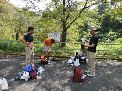 ヘルメットは僕、コンスケ、石坂の3人がかぶる。石坂は会社から防災用のヘルメットを拝借してきたそうだ。ごっついものではなくて、沢用として十分使えそうだ。3人とも申し合わせたように白いヘルメット。裕助は帽子、ベボはタオルをバンダナのように頭に巻く。