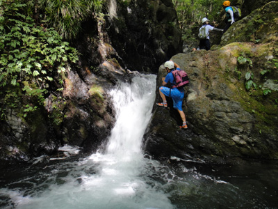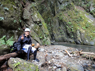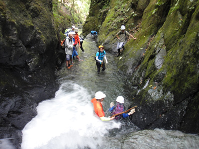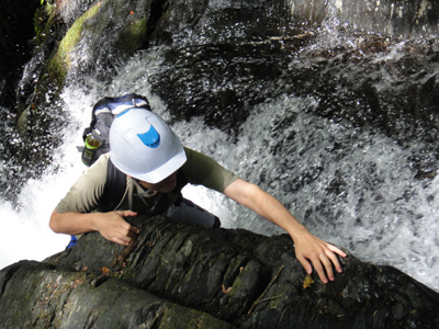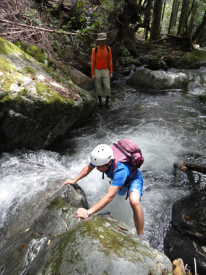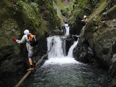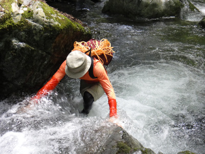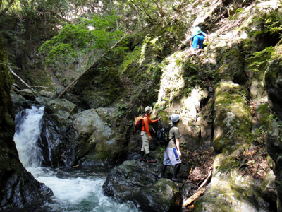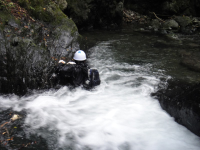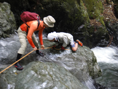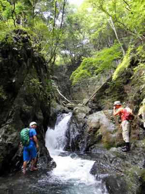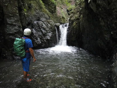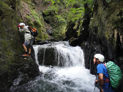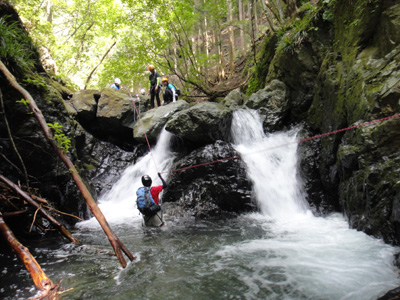 しばらく行くと本格的なゴルジュに突入する。初めの2mくらいの滝のところで、グループの皆さんに追いつく。彼らは、ロープワークの練習をしていた。トップの人が先に渡って滝を登ってロープを固定し、後続がロープを伝って釜を渡渉する。さらに滝の上にある1mくらいの高さの垂直岩を、ロープを使ってよじ登る練習だ。