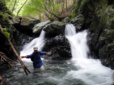 やれやれと再び沢を歩き始める。水は右にカーブして、再び左にカーブしたところに、またもや滝と釜が現れる。なるほどここが例の、グループの皆さんが突破を断念した滝だ。