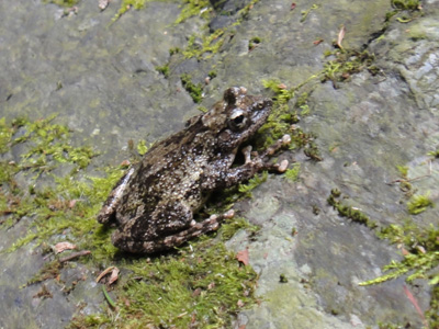 このカエルの姿勢は明らかに尋常じゃない。バンザイをしている。見ていると、徐々に彼(彼女)は下にずり落ちている。何とか岩壁にへばりつこうとするポーズなのだ。それにしても何が彼(彼女)をそこまで岩壁に執着させるのだろうか。水の中に落ちてもカエルなら問題なかろうに。僕らと同じように滝を登りたいのだろうか。滝を登ると食べ物がたくさんいるとか。